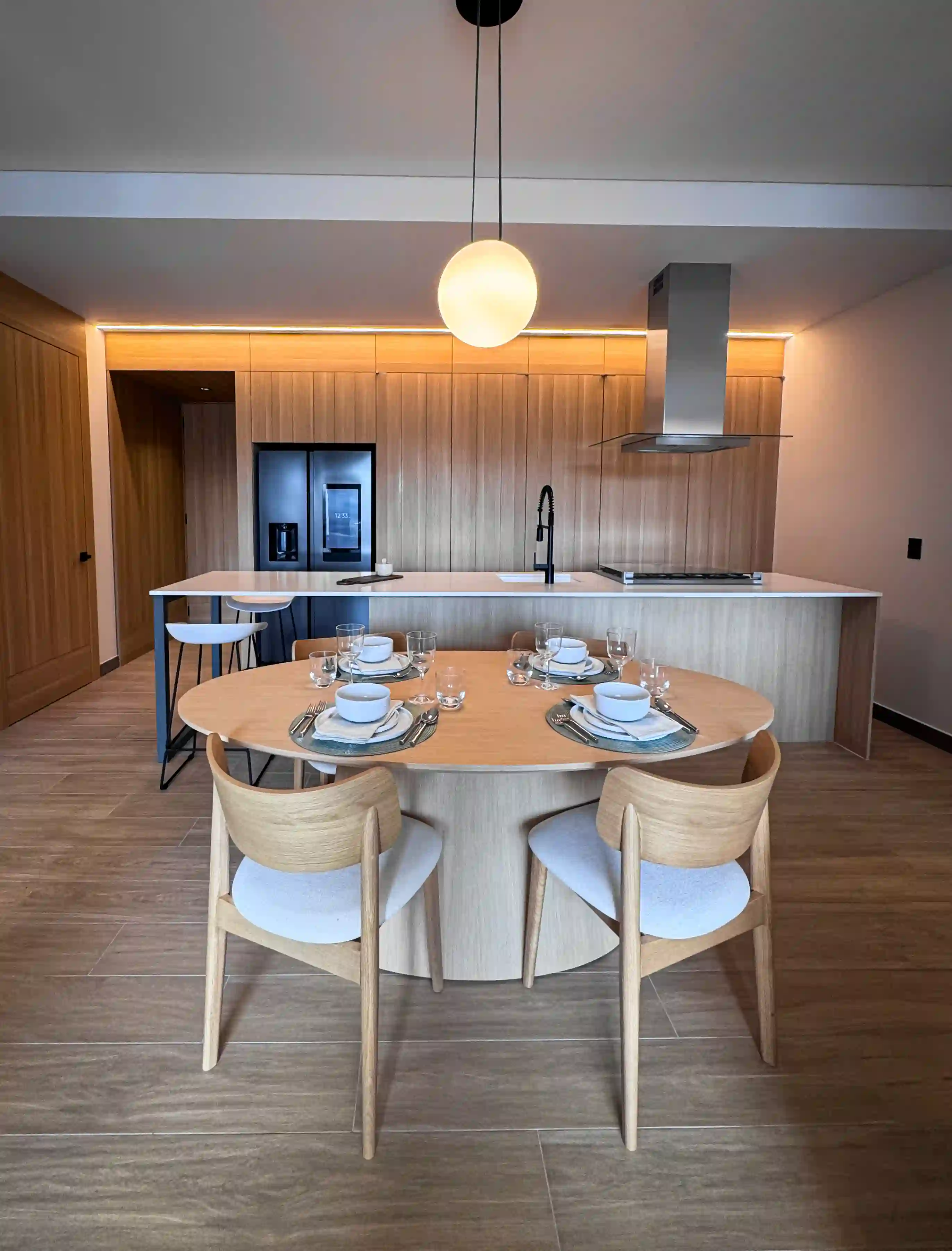 La cocina, resuelta mediante una isla central, funciona como el elemento articulador del espacio, permitiendo una transición natural hacia el comedor y la sala. La selección de materiales cálidos, la iluminación indirecta y la continuidad en pisos y carpinterías refuerzan la sensación de unidad y orden. La sala, vinculada visualmente al exterior, se percibe como un espacio cómodo y acogedor, pensado tanto para el descanso como para la reunión, consolidando un ambiente social, equilibrado y funcional.