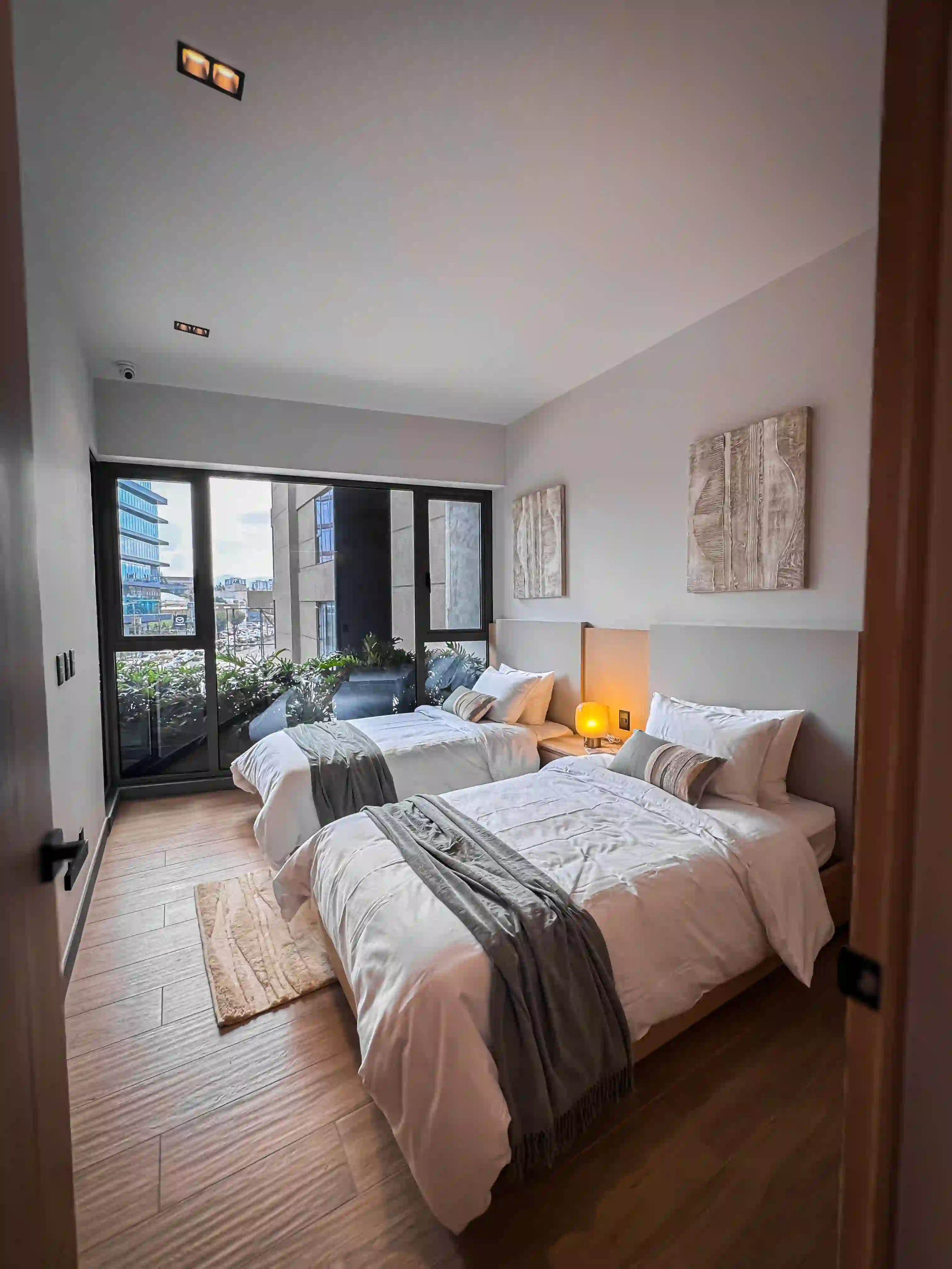 ESPACIOS ÍNTIMOS PARA EL DESCANSOLas habitaciones, tanto la principal como la secundaria, se conciben como espacios destinados al descanso y la desconexión, manteniendo el mismo lenguaje sobrio y cálido que define al resto del departamento. La distribución prioriza la claridad espacial y la funcionalidad, evitando elementos innecesarios y permitiendo que la atmosfera sea serena y ordenada.