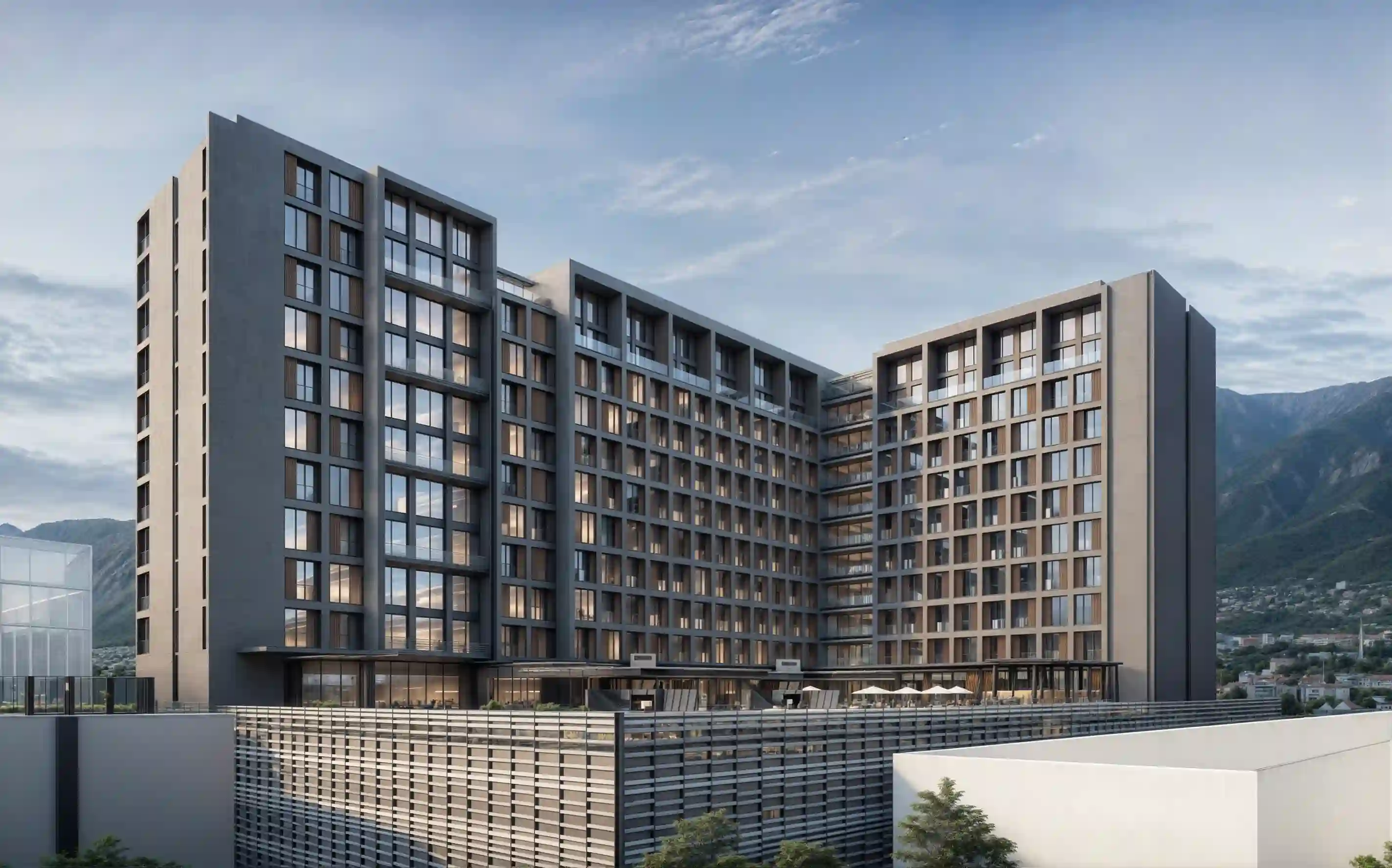 ARQUITECTURA HABITACIONAL CONTEMPORÁNEAEl componente habitacional del proyecto se desarrolla bajo una lógica de eficiencia espacial y calidad arquitectónica. Cada unidad está pensada para ofrecer espacios bien proporcionados, con una distribución clara que favorece la funcionalidad y el confort cotidiano. Las fachadas habitacionales reflejan esta intención mediante una modulación constante de vanos, que aporta orden visual y garantiza una adecuada relación entre interior y exterior.