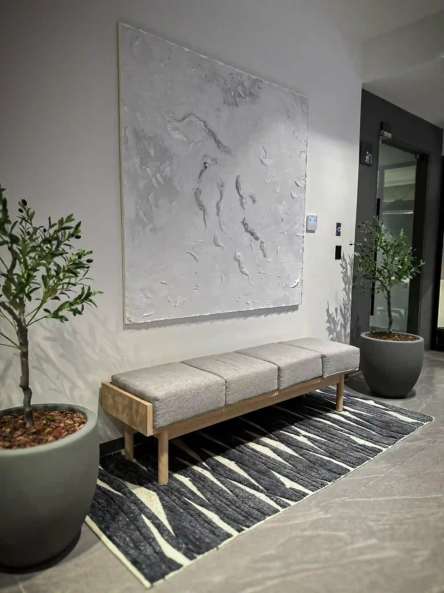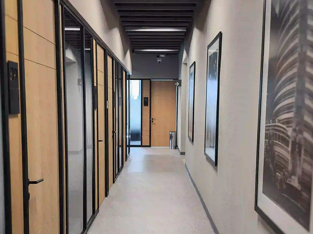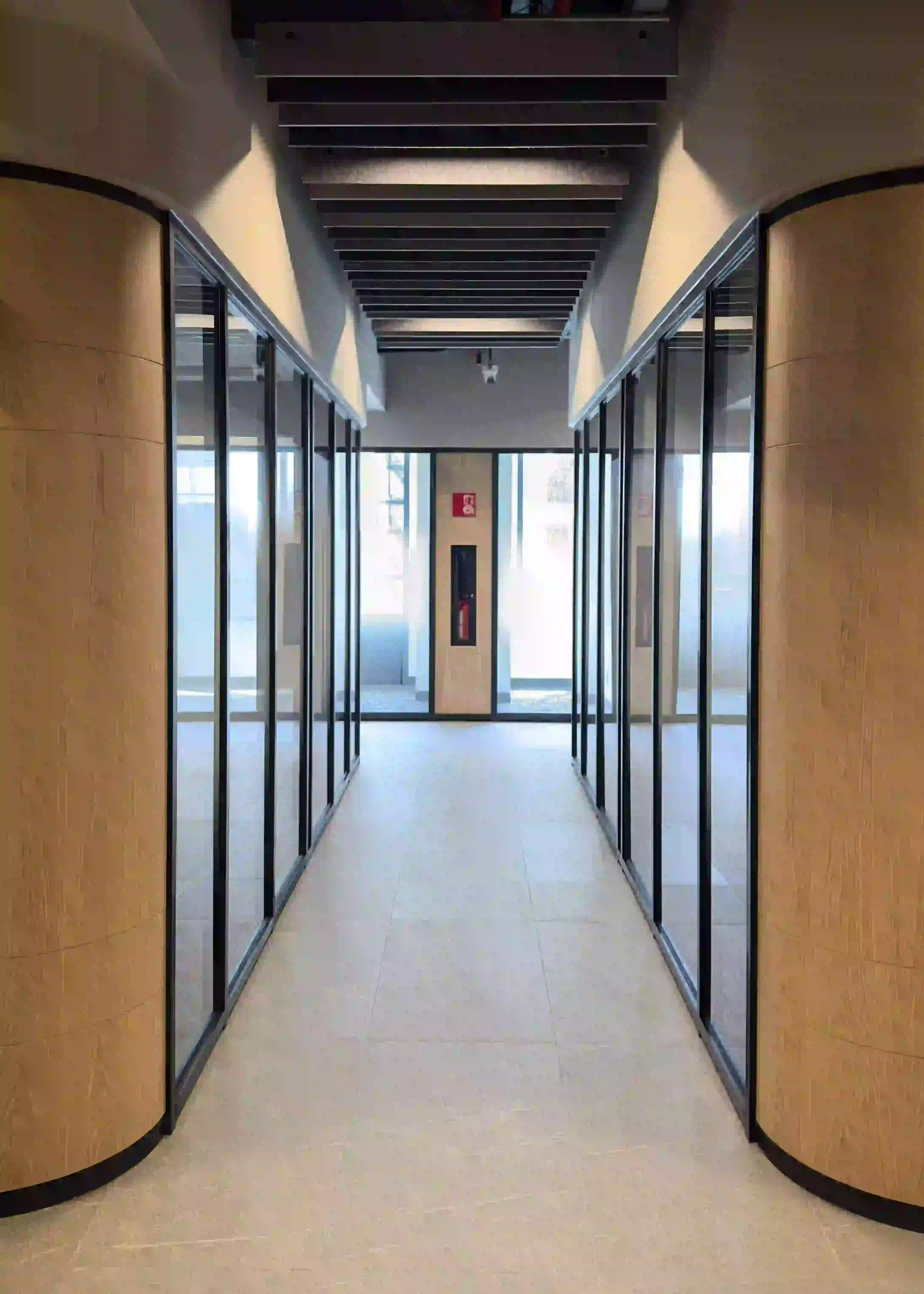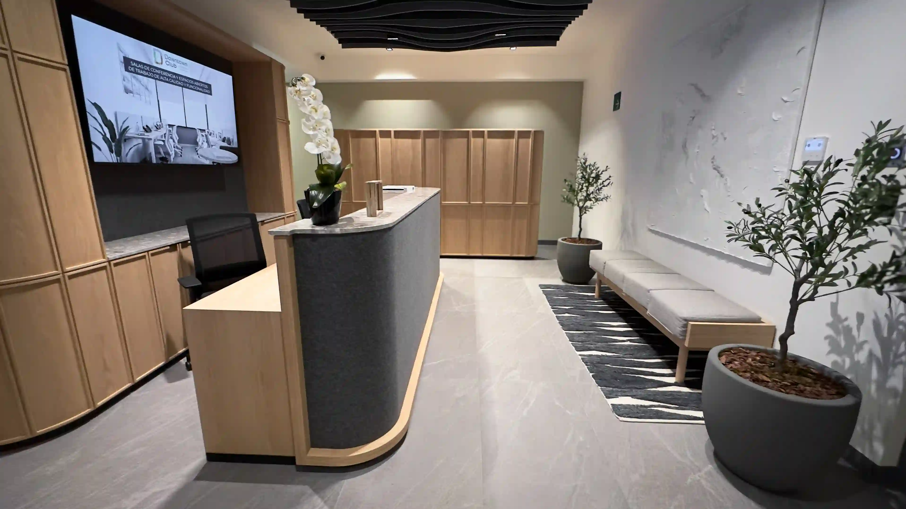 MATERIALIDAD Y ARQUITECTURA DE INTERIORESEl lenguaje arquitectónico de Downtown Club se define por un rigor técnico que prioriza la claridad visual y el confort sensorial en cada rincón. El contraste entre la calidez de los lambrines de madera y la sobriedad de la cancelería esbelta en color negro crea una estética moderna y atemporal que transmite solidez y profesionalismo. Un elemento fundamental de esta propuesta es el tratamiento del plano superior: el uso de bafles acústicos de diseño lineal y ondulado no solo cumple una función técnica crítica al garantizar un entorno silencioso libre de reverberaciones, sino que aporta un dinamismo escultórico que guía el recorrido del usuario. La iluminación lineal LED se integra de manera casi imperceptible en estas estructuras, proporcionando una luz clara y eficiente que reduce la fatiga visual durante las jornadas laborales. Cada material, desde el pavimento pétreo de gran formato hasta los acabados esmerilados en las mamparas de cristal, ha sido seleccionado para ofrecer una experiencia táctil y visual premium, asegurando que la infraestructura soporte las exigencias de un entorno corporativo de clase mundial sin sacrificar la elegancia ni la calidez ambiental.