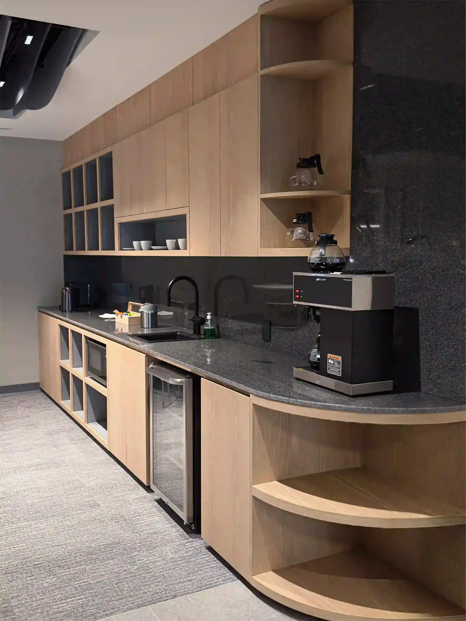 ESPACIOS DE COLABORACIÓN Y NETWORKINGLa funcionalidad de Downtown Club alcanza su máxima expresión en sus áreas dedicadas a la colaboración y el intercambio de ideas, diseñadas para responder a las dinámicas del trabajo híbrido actual. Las salas de juntas privadas, equipadas con mesas de mármol de diseño monolítico y tecnología audiovisual de punta, se presentan como escenarios ideales para la toma de decisiones estratégicas en un entorno de total privacidad. De forma complementaria, las zonas de lounge y el área de coworking ofrecen una atmósfera más relajada, con mobiliario ergonómico y sofás modulares de formas orgánicas que invitan al networking informal y a la creatividad colectiva. El área de coffee station, con sus acabados en piedra oscura y estanterías de madera, funciona como el corazón social del complejo, un punto de encuentro que eleva la experiencia diaria de los usuarios mediante un servicio de hospitalidad refinado. La transparencia garantizada por las divisiones acristaladas de piso a techo mantiene una conexión visual constante con el resto del "Hub", promoviendo una sensación de amplitud y comunidad. En conjunto, estas áreas forman un ecosistema flexible y vibrante que impulsa el crecimiento empresarial en un entorno de lujo, confort y eficiencia absoluta.