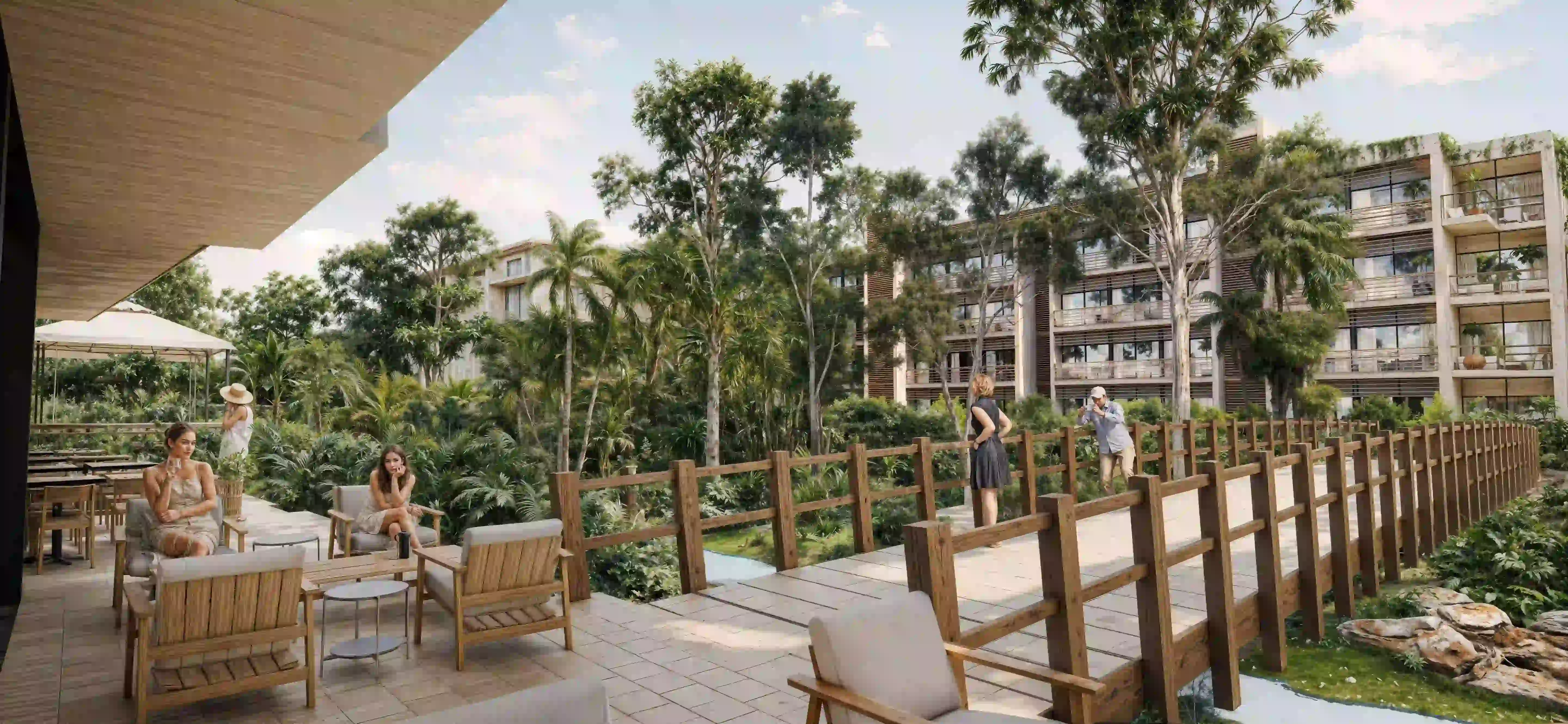 PAISAJE COMO ELEMENTO ESTRUCTURADOREl paisaje juega un papel fundamental dentro del master plan Guatemala Escuintla, no solo como componente estético, sino como un verdadero elemento estructurador del proyecto. Las áreas verdes, andadores y espacios abiertos se conciben como una red continua que conecta los distintos usos y genera una experiencia urbana más amable y climáticamente confortable. La vegetación se integra de manera estratégica para proporcionar sombra, regular la temperatura y reforzar la identidad natural del conjunto.