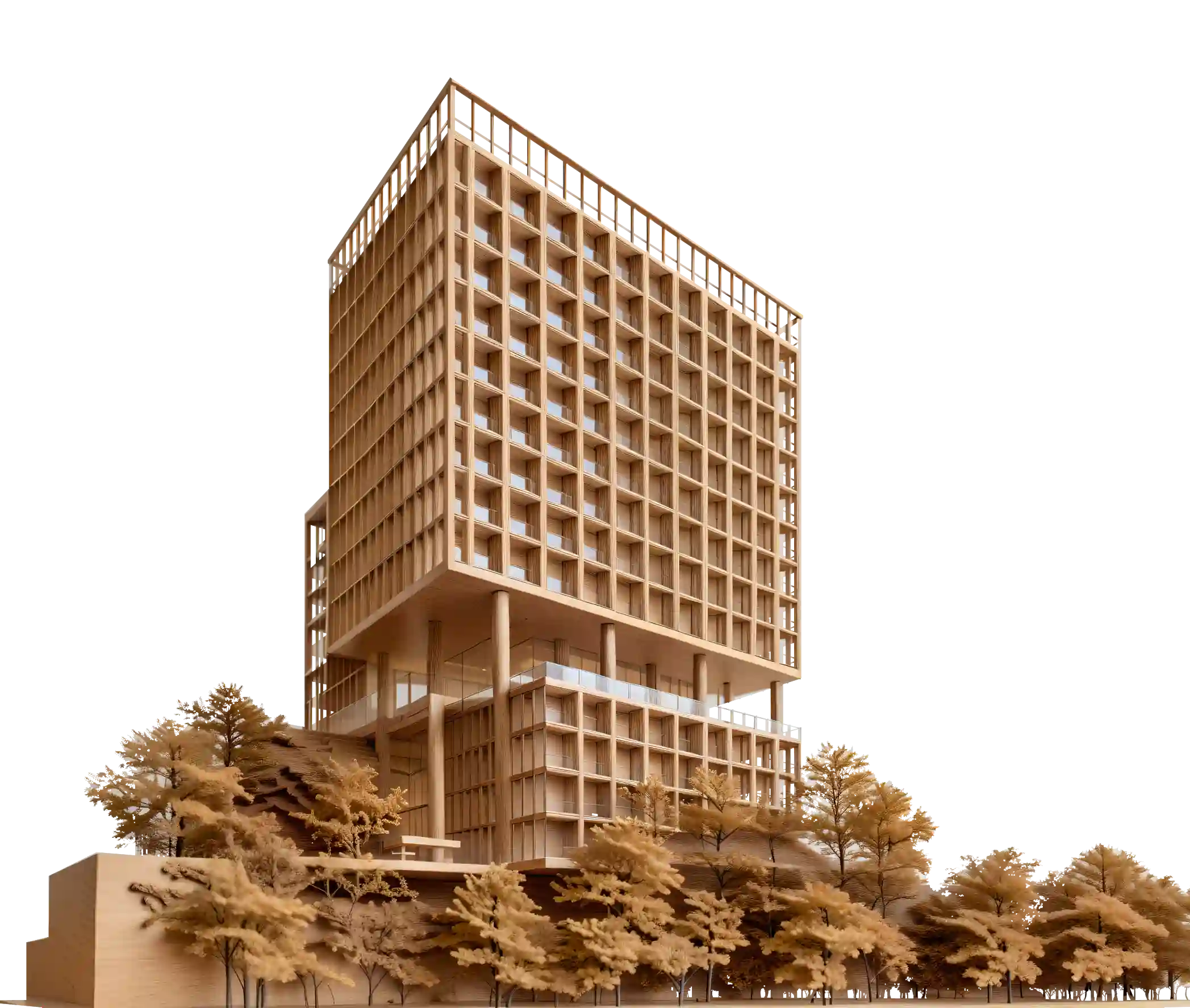 La volumetría se organiza a partir de cuerpos superpuestos que fragmentan la escala del edificio y permiten una lectura más amable de su altura. Esta configuración escalonada introduce terrazas y vacíos intermedios que funcionan como espacios de transición, aportando áreas verdes elevadas y puntos de encuentro que enriquecen la experiencia urbana. De esta manera, el proyecto propone una verticalidad activa, que no se aísla del contexto, sino que dialoga con él a distintas alturas.