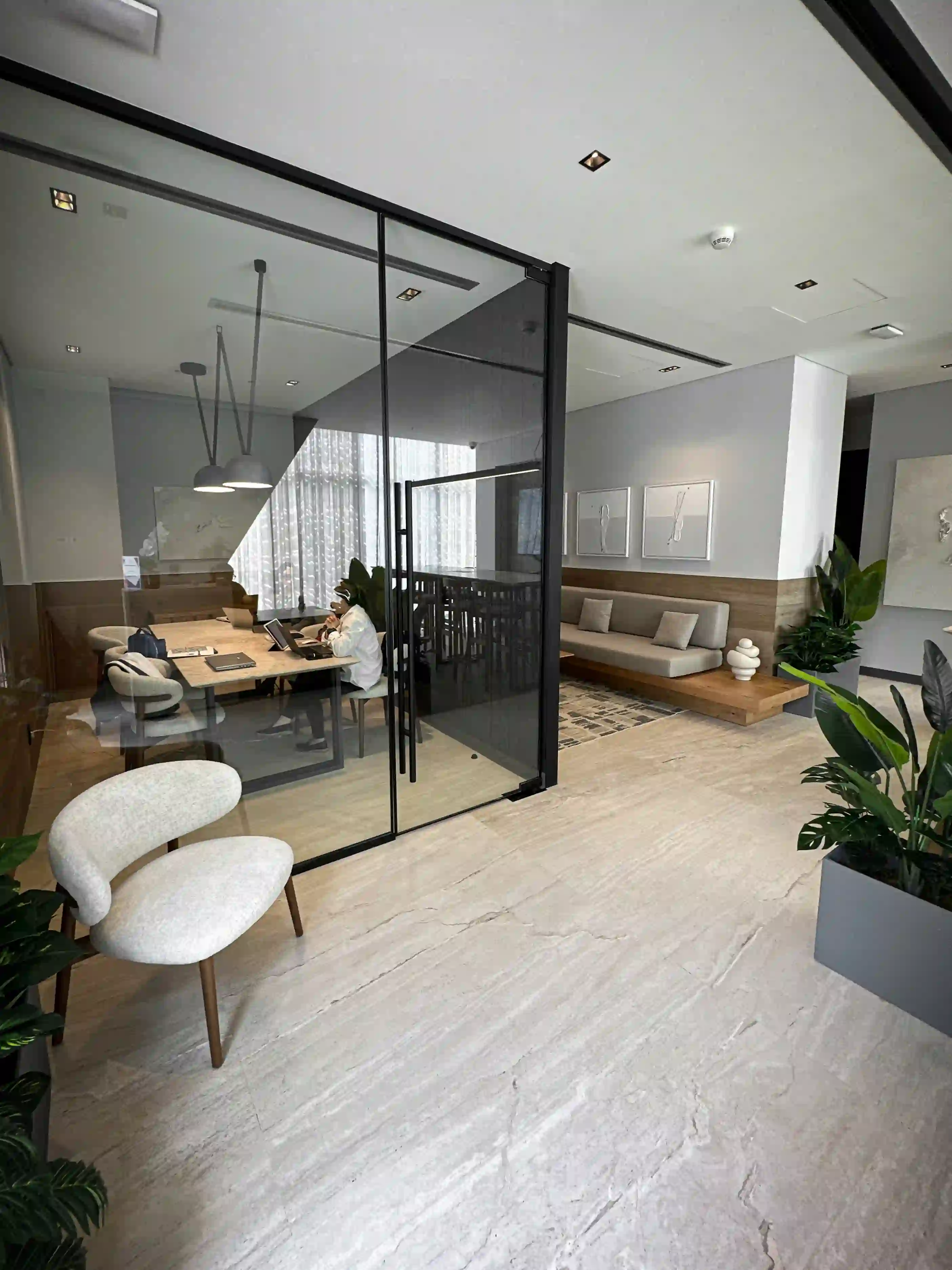 La fluidez espacial se garantiza mediante el uso de cancelería esbelta y grandes paños de cristal, los cuales permiten una permeabilidad visual constante a través de todo el recinto. Este diseño no solo optimiza el uso del espacio, sino que proyecta una imagen de transparencia y apertura, permitiendo que la luz natural recorra libremente el interior. Cada rincón del showroom ha sido diseñado para inspirar, mostrando cómo la arquitectura de interiores puede transformar una simple oficina en un escenario de vida aspiracional y elegante.