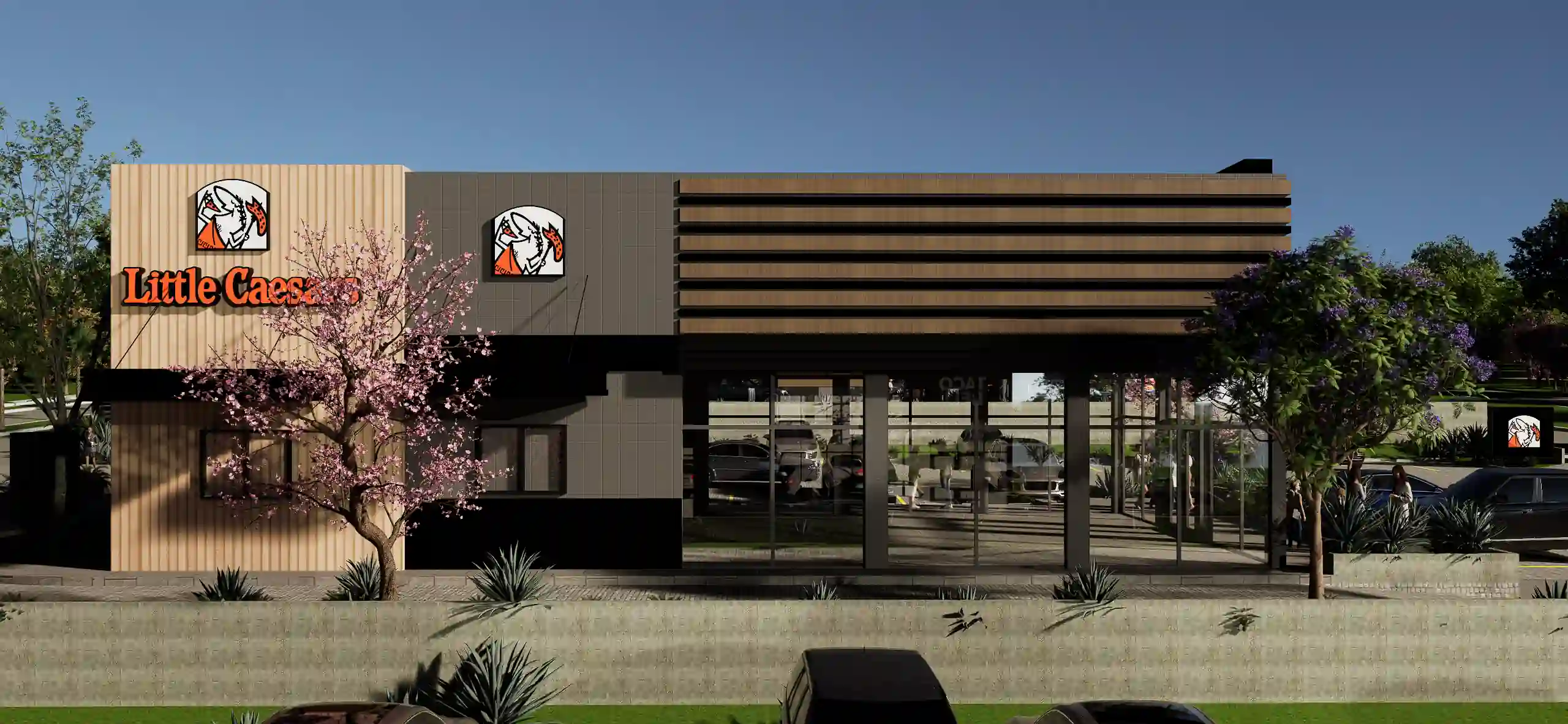 IDENTIDAD Y LENGUAJE ARQUITECTÓNICOEl desafío arquitectónico de Pads Guatemala consistió en crear una envolvente estética coherente que pudiera albergar diversas identidades corporativas de marcas globales, como Little Caesars y Taco Bell, sin comprometer su visibilidad ni su manual de marca. Se optó por un estilo industrial-contemporáneo que utiliza una paleta de materiales honestos y sofisticados para unificar el conjunto. Las fachadas están compuestas por paneles arquitectónicos en tonos gris oxford y grafito, los cuales proporcionan una base sobria y elegante para los acentos cromáticos de cada comercio.