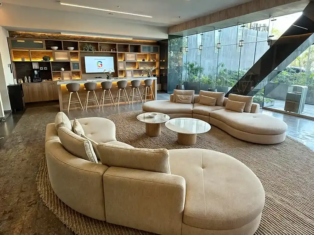 Sofás modulares de formas orgánicas y mesas de centro en piedra natural delimitan visualmente las zonas de estancia, creando nichos de privacidad dentro de la amplitud social. El rediseño de estos layouts ha permitido una mayor fluidez espacial y un renovado sentido de pertenencia por parte de los usuarios. Ya sea para una reunión informal o un evento social de gala, estas áreas ofrecen la infraestructura necesaria de hospitalidad refinada y diseño de vanguardia, consolidando al proyecto como un referente de estilo de vida vertical y sofisticación urbana en Guadalajara.