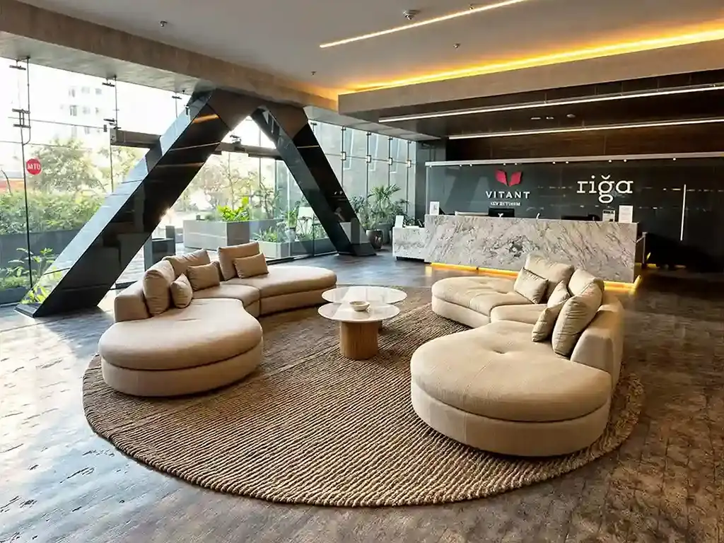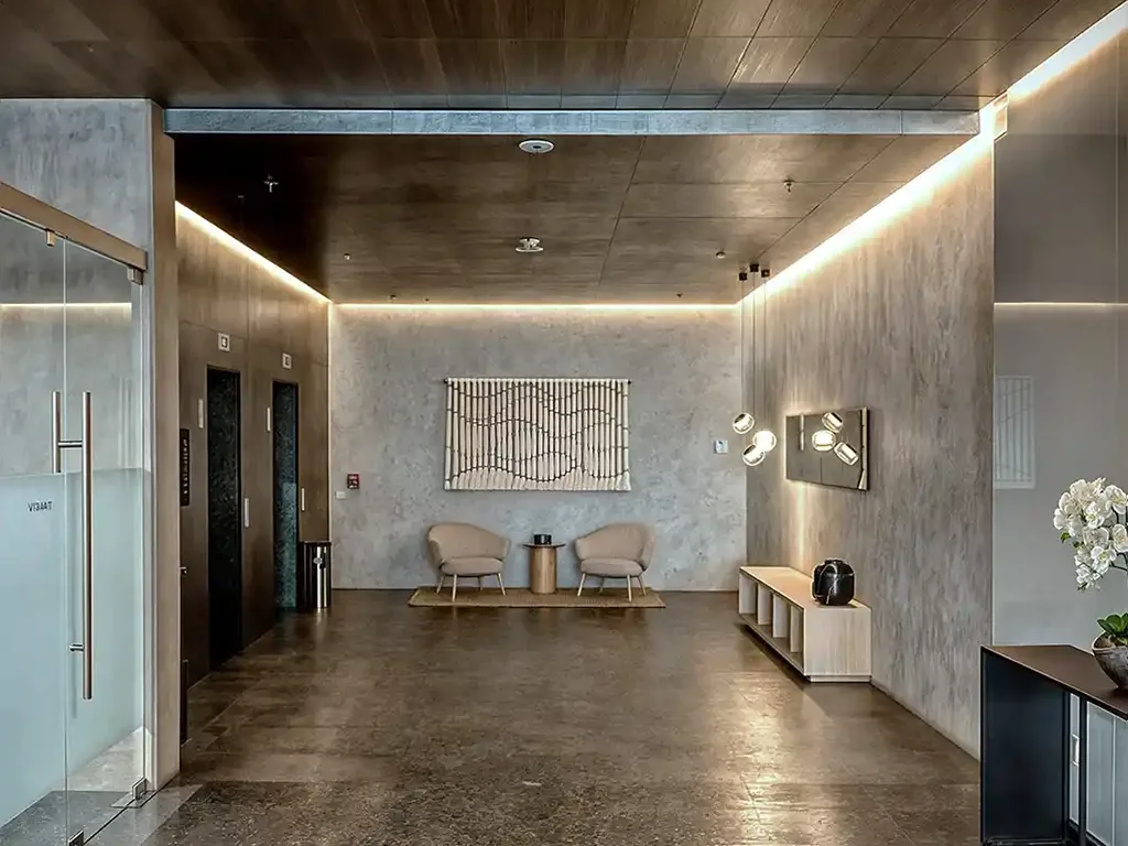 ELEGANCIA Y SENTIDO DE ARRIBOEl lobby de Vitant Riga Country es la antesala de una experiencia de habitar superior, concebida para transmitir una elegancia serena desde el primer contacto. Este espacio de gran altura destaca por su honestidad constructiva, utilizando muros de concreto aparente que contrastan con lambrines de madera clara y pavimentos pétreos de gran formato. El diseño se complementa con piezas de arte textil de gran escala que añaden textura y color a la sobriedad arquitectónica. La iluminación juega un papel crucial en este espacio, combinando luz indirecta cálida con luminarias decorativas de diseño minimalista que resaltan las vetas de los materiales naturales. La disposición del mobiliario de autor crea islas de espera y conversación que se sienten tanto profesionales como acogedoras. Cada detalle ha sido meticulosamente planeado para fomentar un sentido de pertenencia y seguridad, asegurando que el arribo al edificio sea percibido como el ingreso a un santuario privado en medio del dinamismo de la metrópoli jalisciense.