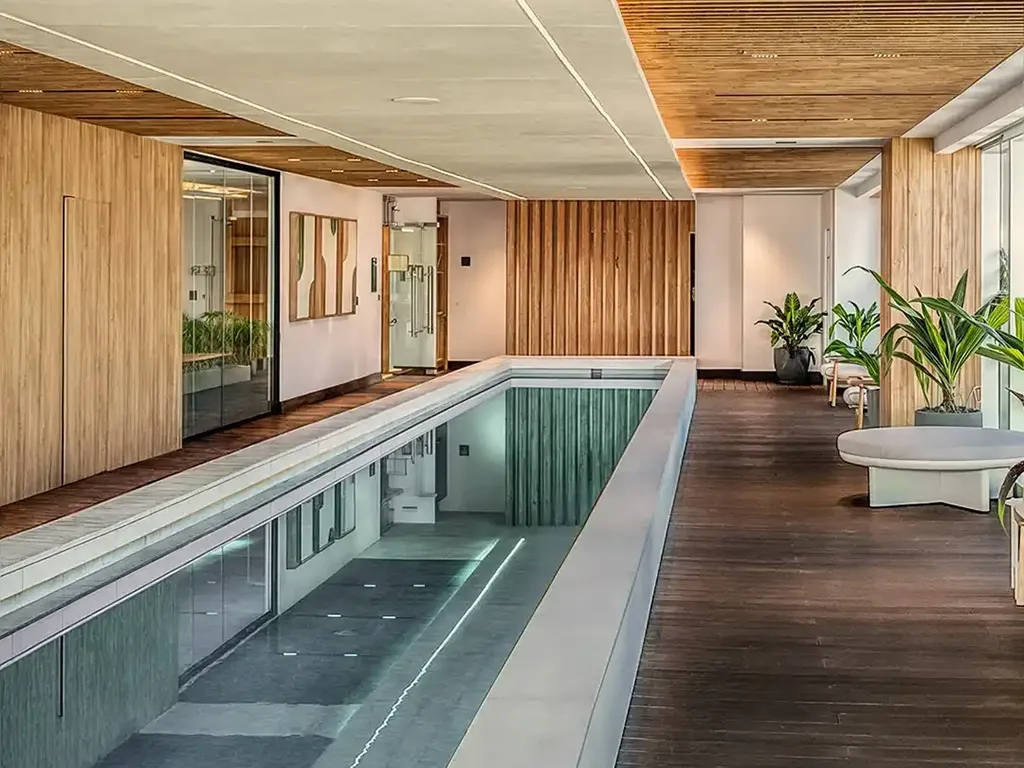 Este entorno ha sido concebido bajo premisas de ergonomía e iluminación puntual, creando una atmósfera etérea durante el día y sofisticada por la noche. La integración de áreas de descanso perimetrales con mobiliario de lino y texturas suaves invita a la permanencia, transformando el área de nado en un centro de bienestar integral donde el agua, la luz y la madera convergen para regenerar los sentidos de los residentes.