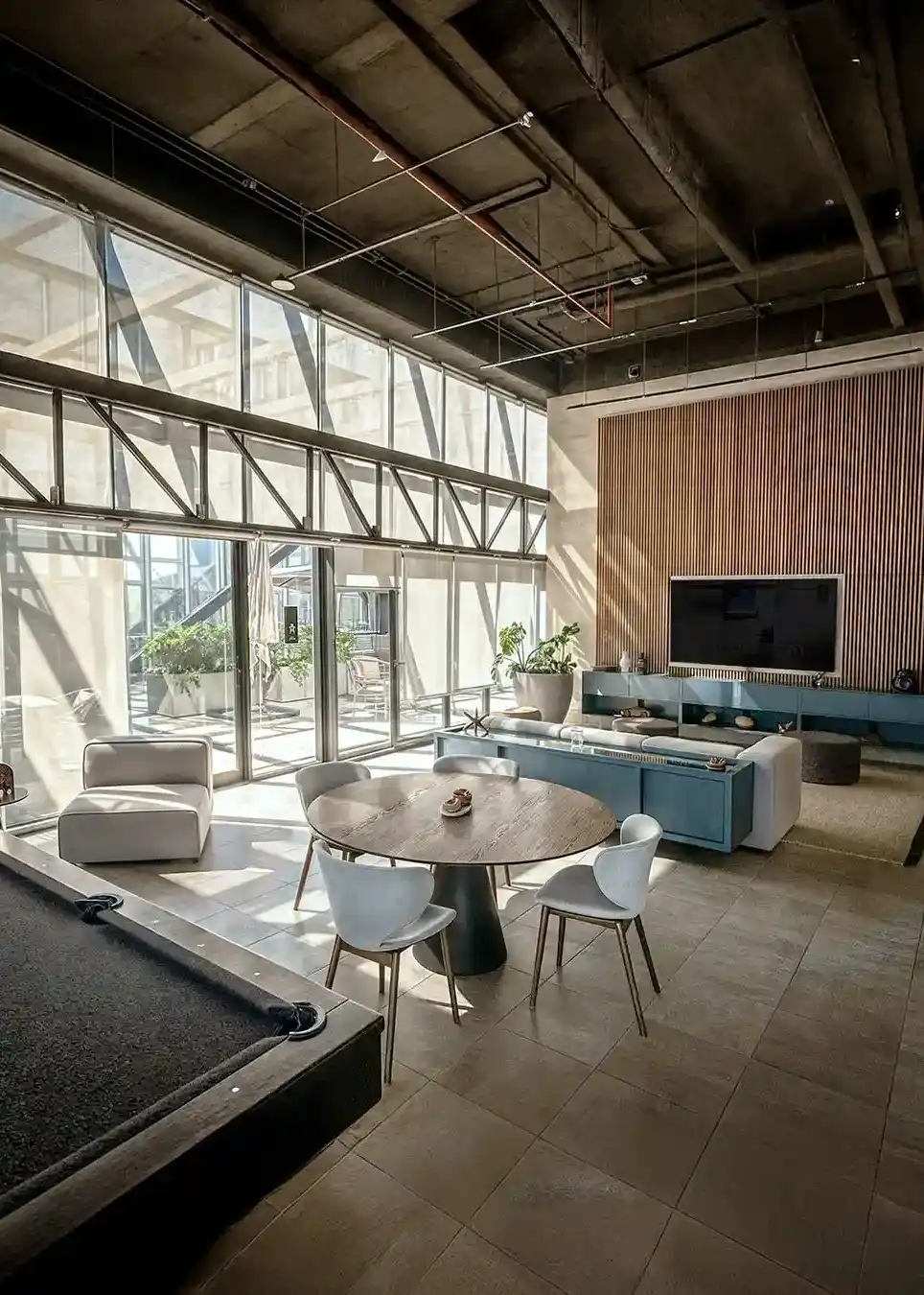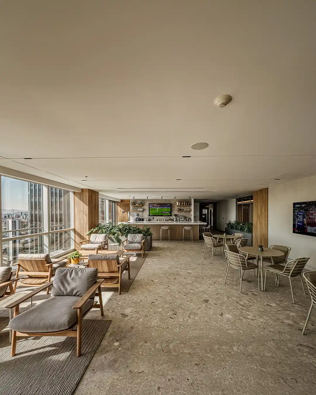 SOCIALIZACIÓN SOFISTICADALas áreas sociales de Vitant Riga Country representan el corazón de la convivencia residencial, diseñadas para adaptarse a diversos ritmos de uso y eventos privados. Estos espacios destacan por sus amplios ventanales que integran el skyline de la ciudad, creando una conexión visual constante con el entorno. La paleta de colores se mantiene en una gama de neutros sofisticados, utilizando grises cálidos y maderas naturales que aportan una calidez orgánica inmediata.
