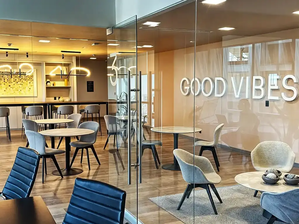 COWORKING: PRODUCTIVIDAD Y SOCIAL HUBEl área de coworking en el nivel 22 responde a las nuevas dinámicas de trabajo híbrido, ofreciendo un entorno que fomenta tanto la concentración como la colaboración creativa. Bajo el lema "Good Vibes", el espacio se concibe como un entorno vibrante y luminoso, donde la transparencia de las divisiones de cristal permite una conectividad visual constante sin sacrificar la acústica necesaria para los negocios.