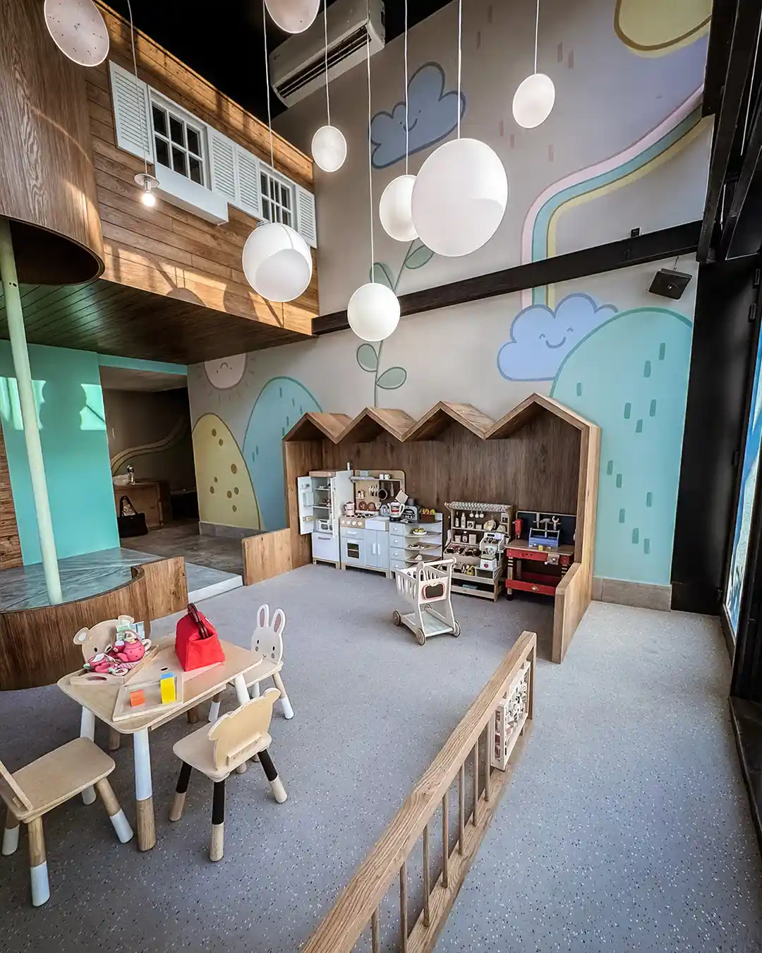 IMAGINACIÓN Y JUEGOEl Kids Club en el nivel 33 es un espacio diseñado para desatar la imaginación de los más pequeños en un entorno seguro y estéticamente impecable. El diseño se aleja de los colores primarios estridentes para abrazar una paleta de tonos pastel y maderas claras que mantienen la coherencia con el resto del edificio. Elementos protagónicos como estructuras de madera que evocan casas de árbol, piscinas de pelotas y muros con murales de nubes y arcoíris crean un universo lúdico único.