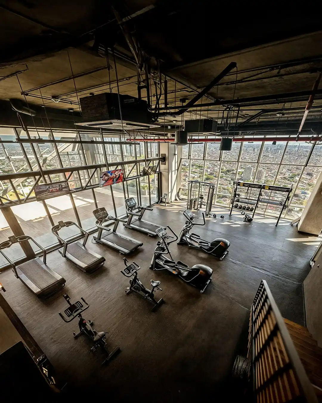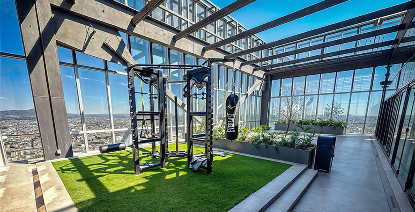 ESTILO DE VIDA EN LAS ALTURASEl gimnasio y las terrazas de asadores en el nivel 33 representan la culminación del concepto de bienestar en Vitant Riga Country. El gimnasio ofrece una experiencia de entrenamiento inmersiva gracias a sus fachadas acristaladas que sitúan al usuario por encima del horizonte de la ciudad. Equipado con tecnología de punta y áreas de ejercicio funcional al aire libre, este espacio potencia la salud física en un entorno de lujo industrial. Por otro lado, la terraza de asadores se concibe como un destino lifestyle para experiencias diversas, incorporando una paleta de materiales clara y vegetación integrada que mitiga la isla de calor.