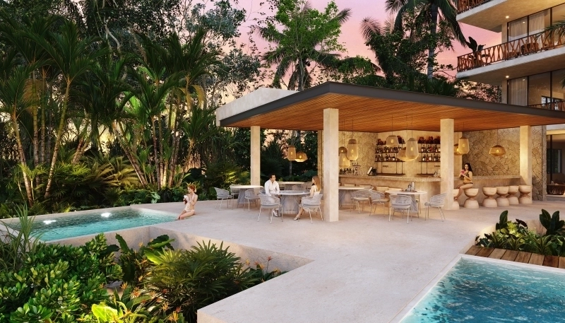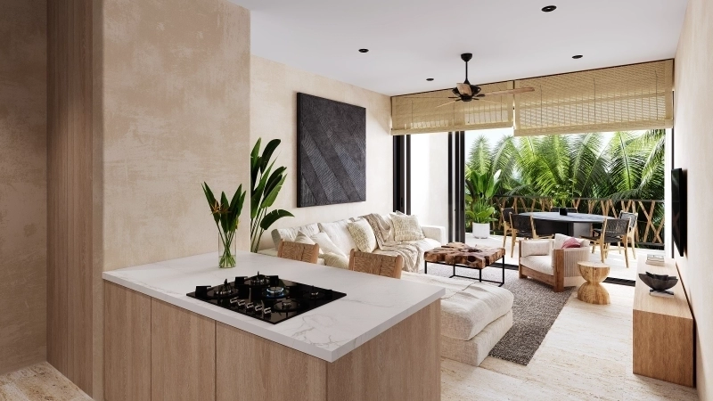 La arquitectura de Arrecife Sisal refleja un compromiso con la integración del lujo y la naturaleza. Los espacios interiores están bañados por la luz natural y diseñados con materiales que evocan la tranquilidad del entorno. Los balcones privados se convierten en extensiones del espacio vital, permitiendo que los residentes se sumerjan completamente en el sonido de las olas y la brisa marina.
