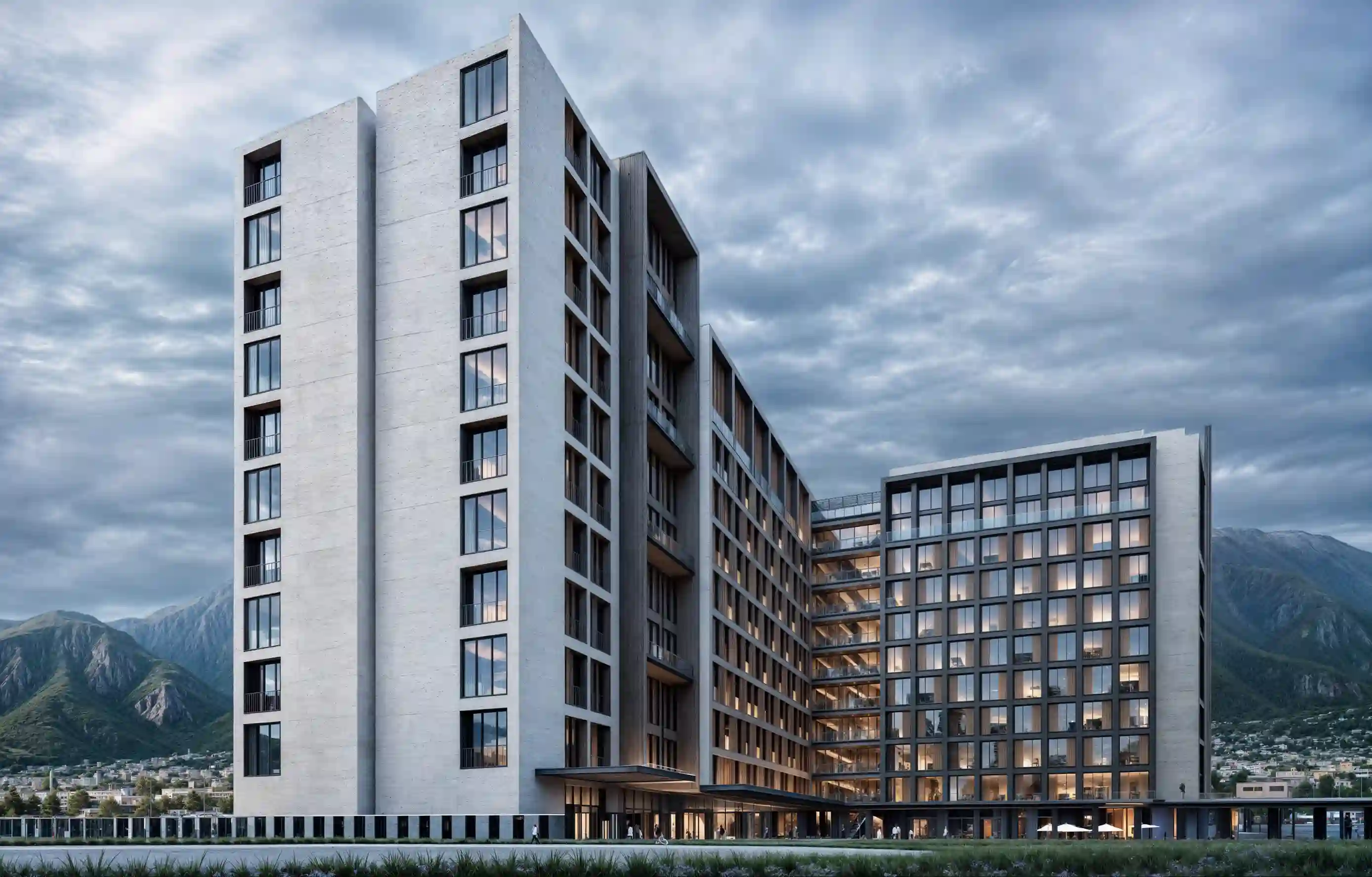 ARQUITECTURA HABITACIONAL CONTEMPORÁNEAEl componente habitacional del proyecto se desarrolla bajo una lógica de eficiencia espacial y calidad arquitectónica. Cada unidad está pensada para ofrecer espacios bien proporcionados, con una distribución clara que favorece la funcionalidad y el confort cotidiano. Las fachadas habitacionales reflejan esta intención mediante una modulación constante de vanos, que aporta orden visual y garantiza una adecuada relación entre interior y exterior.
