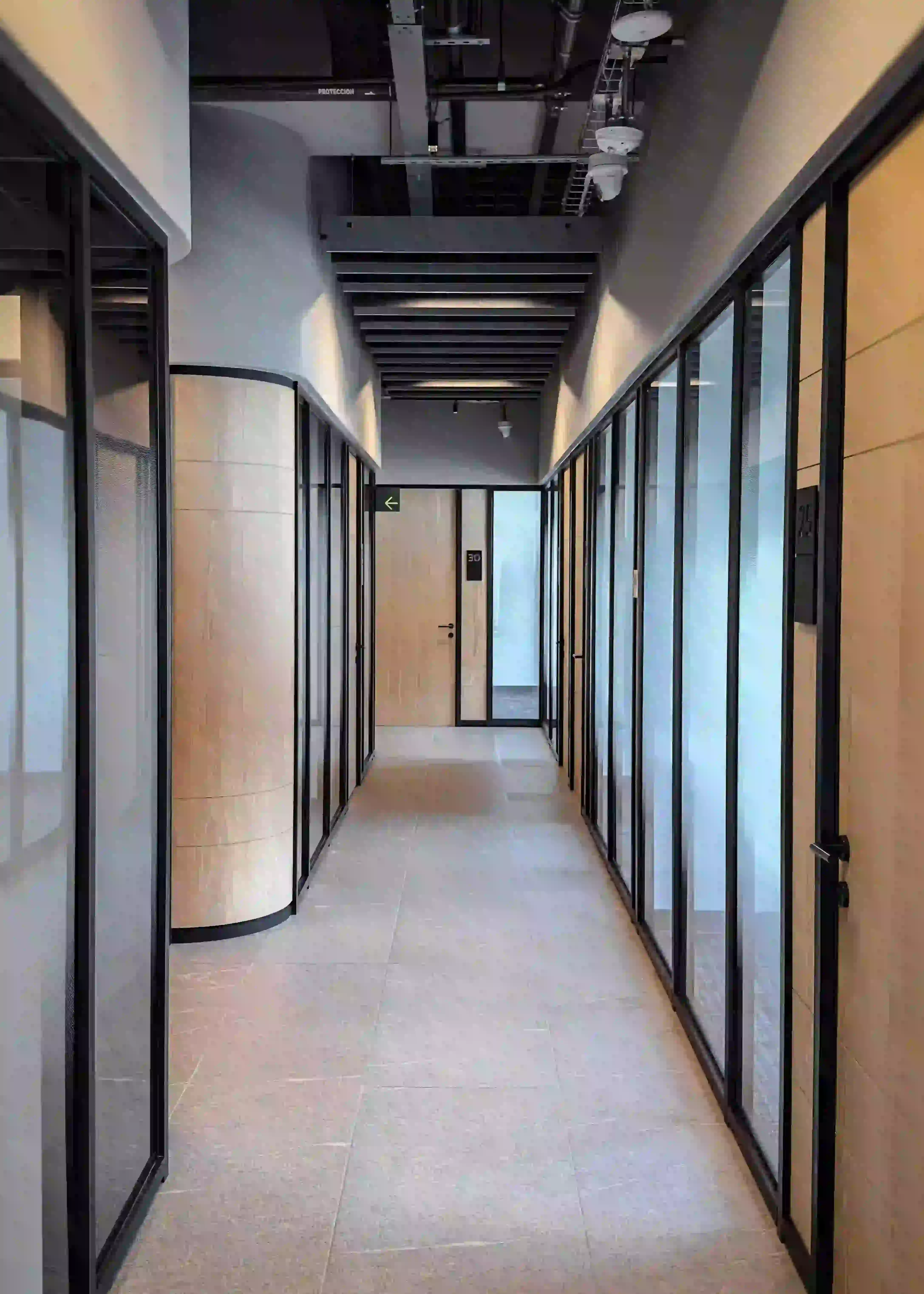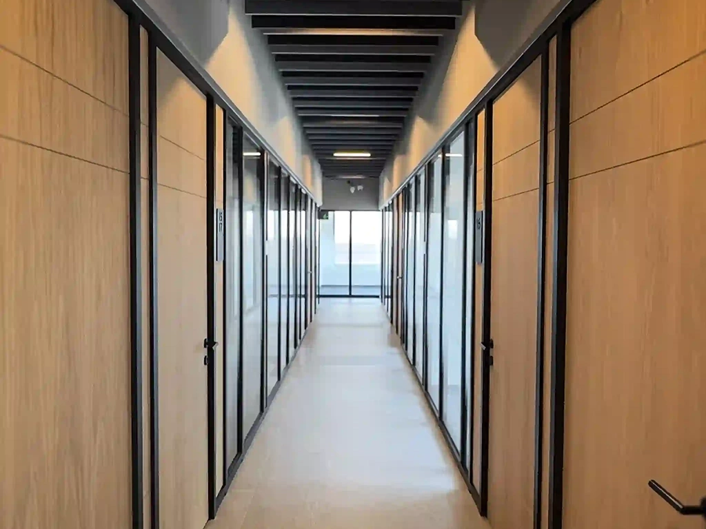 MATERIALIDAD Y ARQUITECTURA DE INTERIORESEl lenguaje arquitectónico de Downtown Club se define por un rigor técnico que prioriza la claridad visual y el confort sensorial en cada rincón. El contraste entre la calidez de los lambrines de madera y la sobriedad de la cancelería esbelta en color negro crea una estética moderna y atemporal que transmite solidez y profesionalismo. Un elemento fundamental de esta propuesta es el tratamiento del plano superior: el uso de bafles acústicos de diseño lineal y ondulado no solo cumple una función técnica crítica al garantizar un entorno silencioso libre de reverberaciones, sino que aporta un dinamismo escultórico que guía el recorrido del usuario. La iluminación lineal LED se integra de manera casi imperceptible en estas estructuras, proporcionando una luz clara y eficiente que reduce la fatiga visual durante las jornadas laborales. Cada material, desde el pavimento pétreo de gran formato hasta los acabados esmerilados en las mamparas de cristal, ha sido seleccionado para ofrecer una experiencia táctil y visual premium, asegurando que la infraestructura soporte las exigencias de un entorno corporativo de clase mundial sin sacrificar la elegancia ni la calidez ambiental.