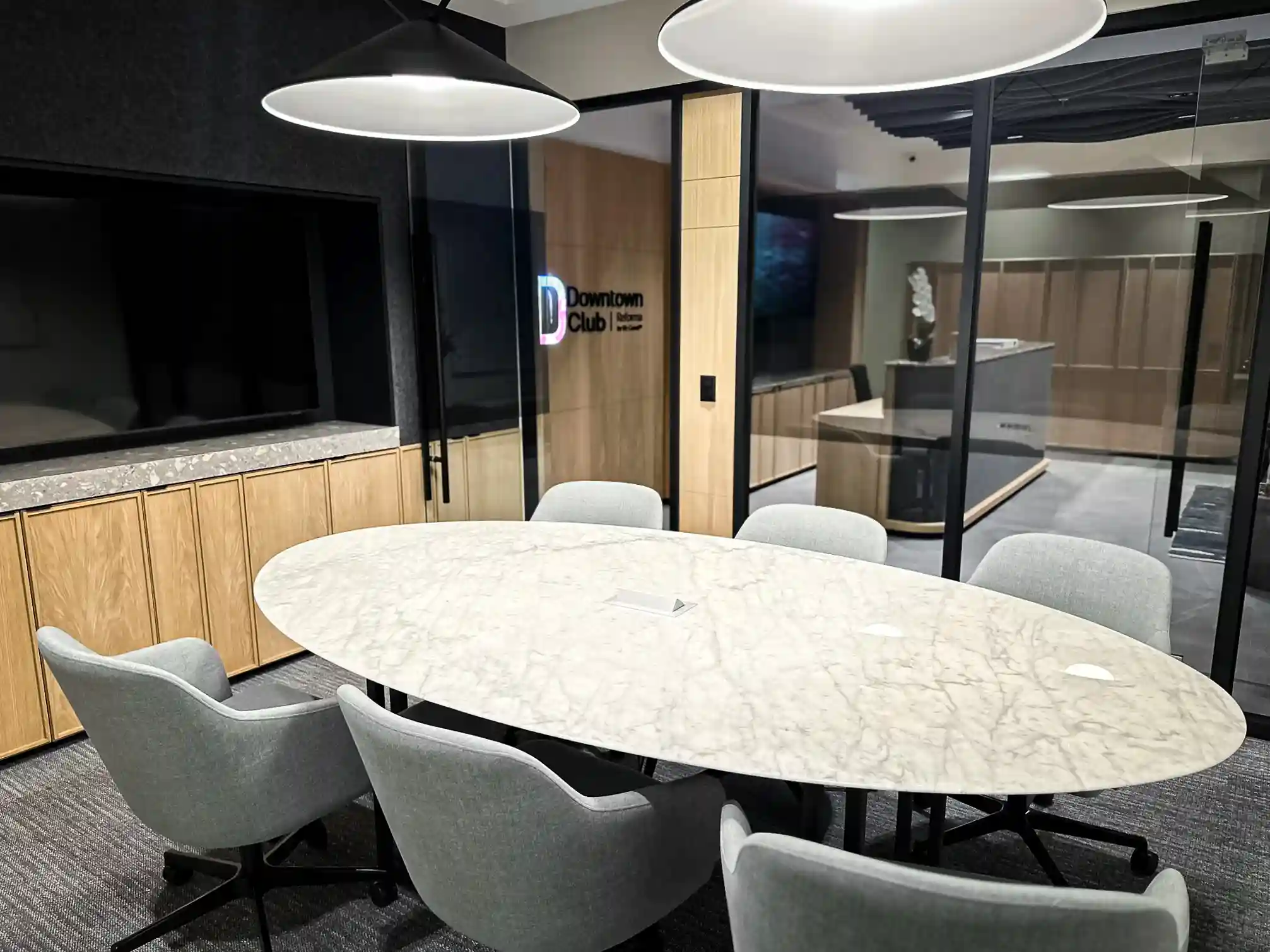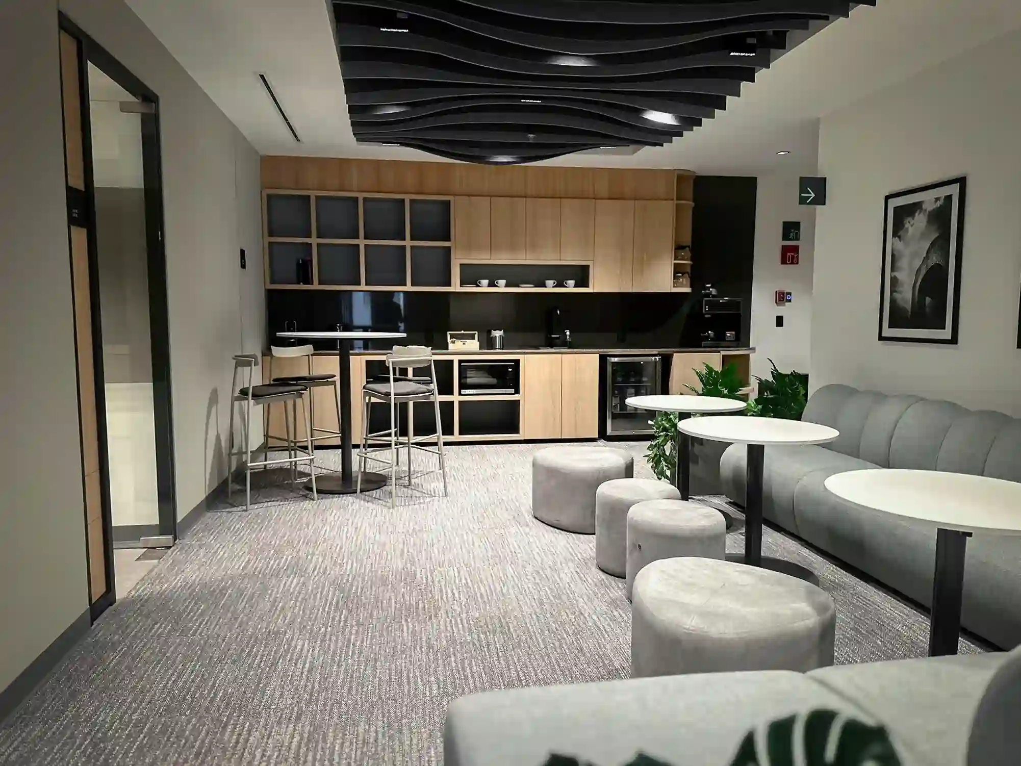 ESPACIOS DE COLABORACIÓN Y NETWORKINGLa funcionalidad de Downtown Club alcanza su máxima expresión en sus áreas dedicadas a la colaboración y el intercambio de ideas, diseñadas para responder a las dinámicas del trabajo híbrido actual. Las salas de juntas privadas, equipadas con mesas de mármol de diseño monolítico y tecnología audiovisual de punta, se presentan como escenarios ideales para la toma de decisiones estratégicas en un entorno de total privacidad. De forma complementaria, las zonas de lounge y el área de coworking ofrecen una atmósfera más relajada, con mobiliario ergonómico y sofás modulares de formas orgánicas que invitan al networking informal y a la creatividad colectiva. El área de coffee station, con sus acabados en piedra oscura y estanterías de madera, funciona como el corazón social del complejo, un punto de encuentro que eleva la experiencia diaria de los usuarios mediante un servicio de hospitalidad refinado. La transparencia garantizada por las divisiones acristaladas de piso a techo mantiene una conexión visual constante con el resto del "Hub", promoviendo una sensación de amplitud y comunidad. En conjunto, estas áreas forman un ecosistema flexible y vibrante que impulsa el crecimiento empresarial en un entorno de lujo, confort y eficiencia absoluta.