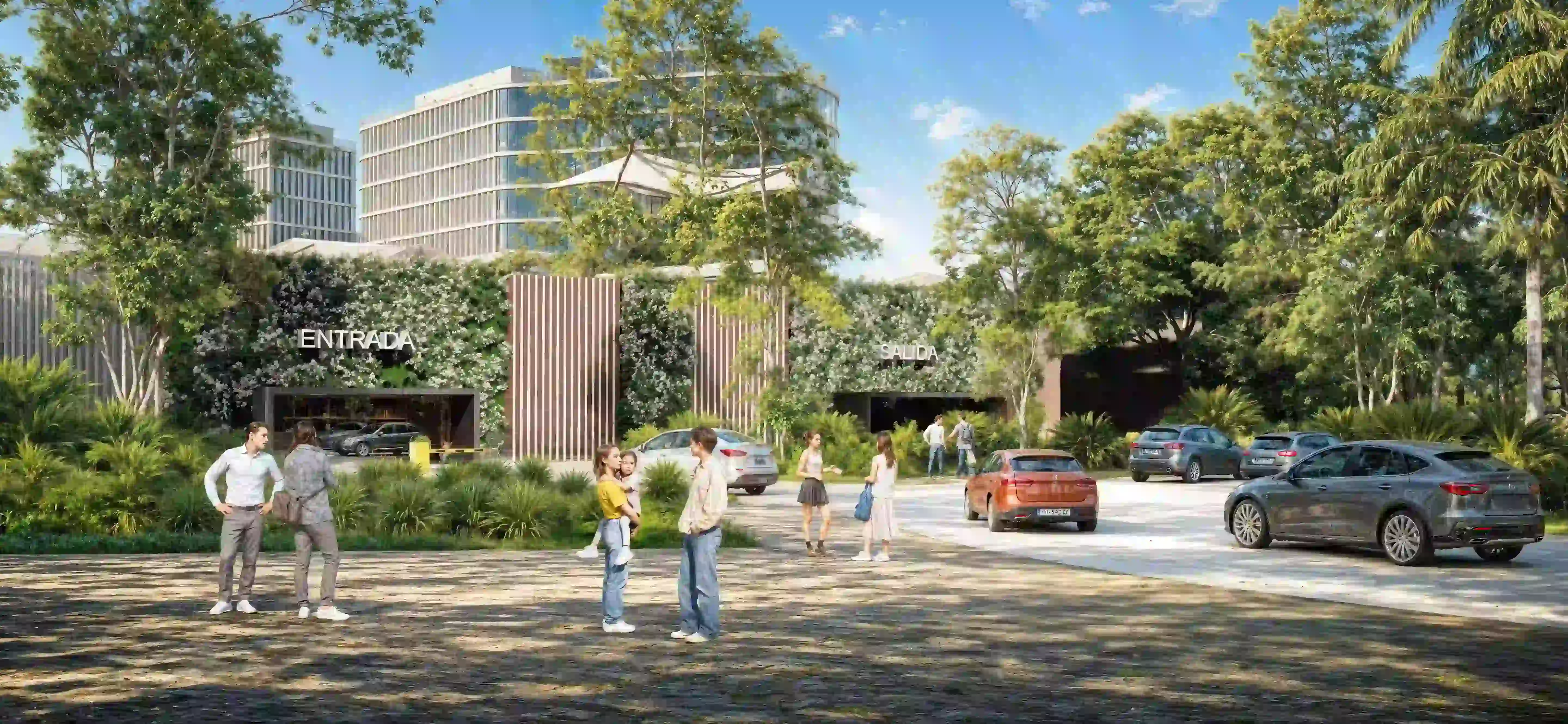 PAISAJE COMO ELEMENTO ESTRUCTURADOREl paisaje juega un papel fundamental dentro del master plan Guatemala Escuintla, no solo como componente estético, sino como un verdadero elemento estructurador del proyecto. Las áreas verdes, andadores y espacios abiertos se conciben como una red continua que conecta los distintos usos y genera una experiencia urbana más amable y climáticamente confortable. La vegetación se integra de manera estratégica para proporcionar sombra, regular la temperatura y reforzar la identidad natural del conjunto.