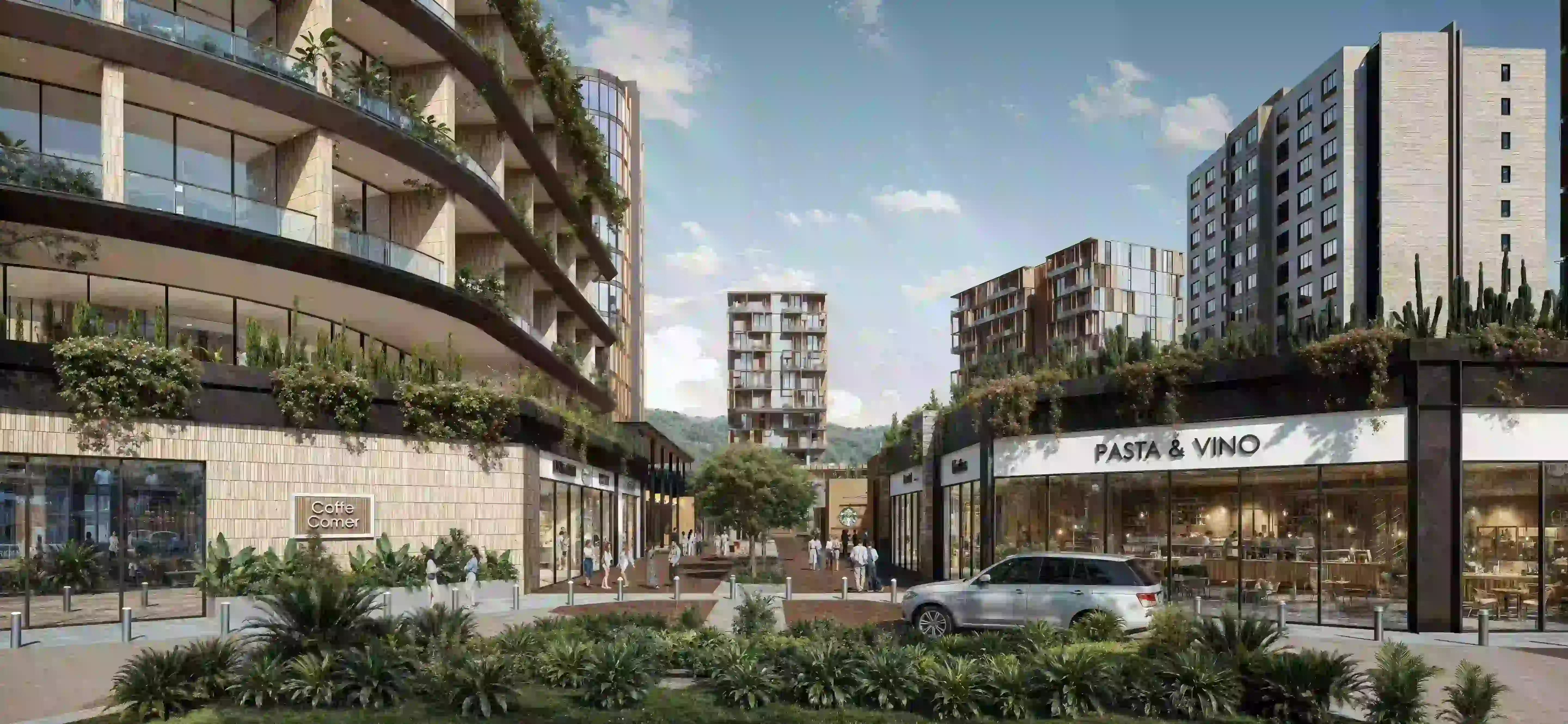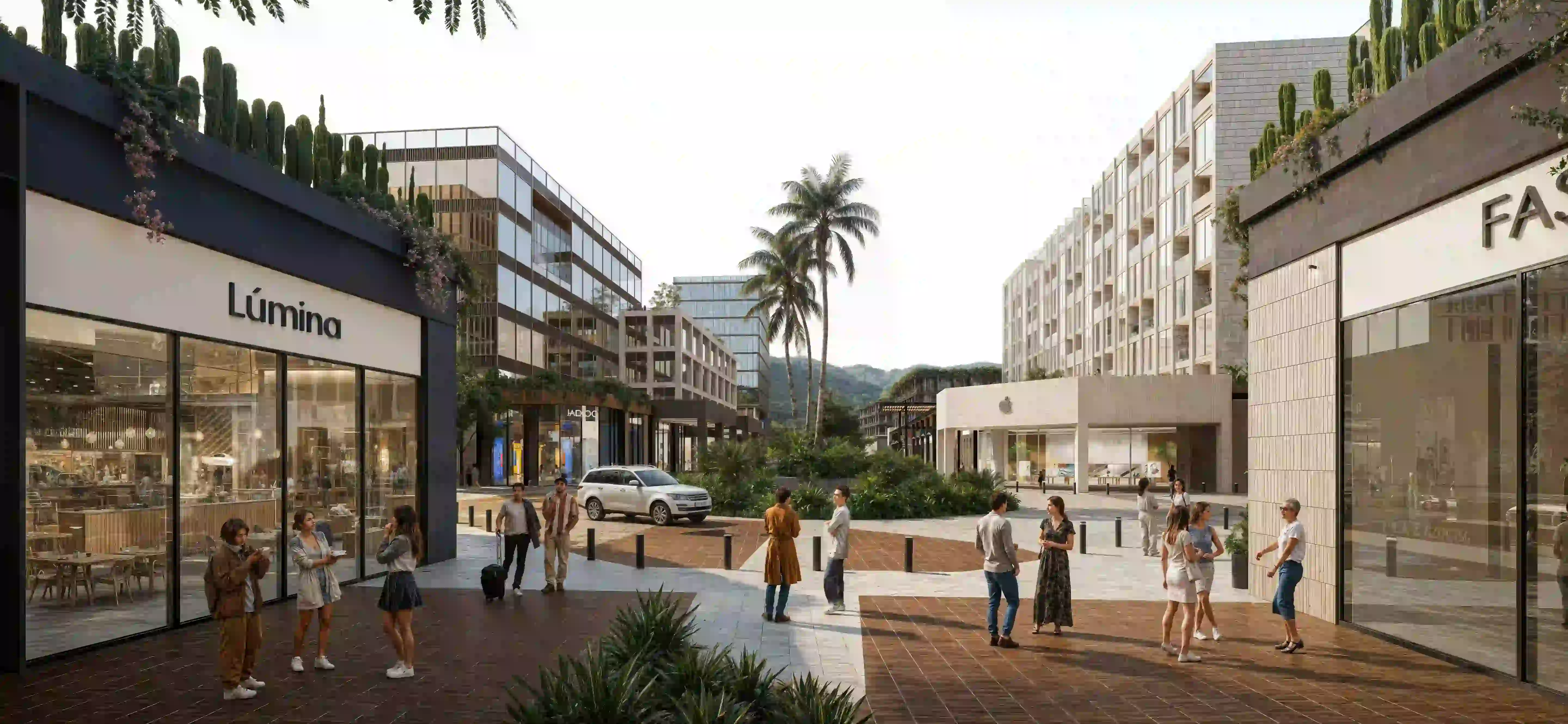RETAIL Y DESTINO LIFESTYLEEl componente comercial de Parque Norte se despliega como un "street mall" de lujo que redefine la experiencia de compra y ocio. Espacios como "Lumina", "Pasta & Vino" y marcas internacionales como Starbucks o Dairy Queen se integran en locales de doble altura con escaparates transparentes que activan la vida a nivel de calle. Este zócalo comercial ha sido diseñado para ser completamente caminable, eliminando barreras visuales y fomentando una interacción constante entre las marcas y el peatón. Las terrazas exteriores invitan a los comensales a disfrutar del clima y del paisaje urbano, convirtiendo cada rincón en un escenario de socialización sofisticada.