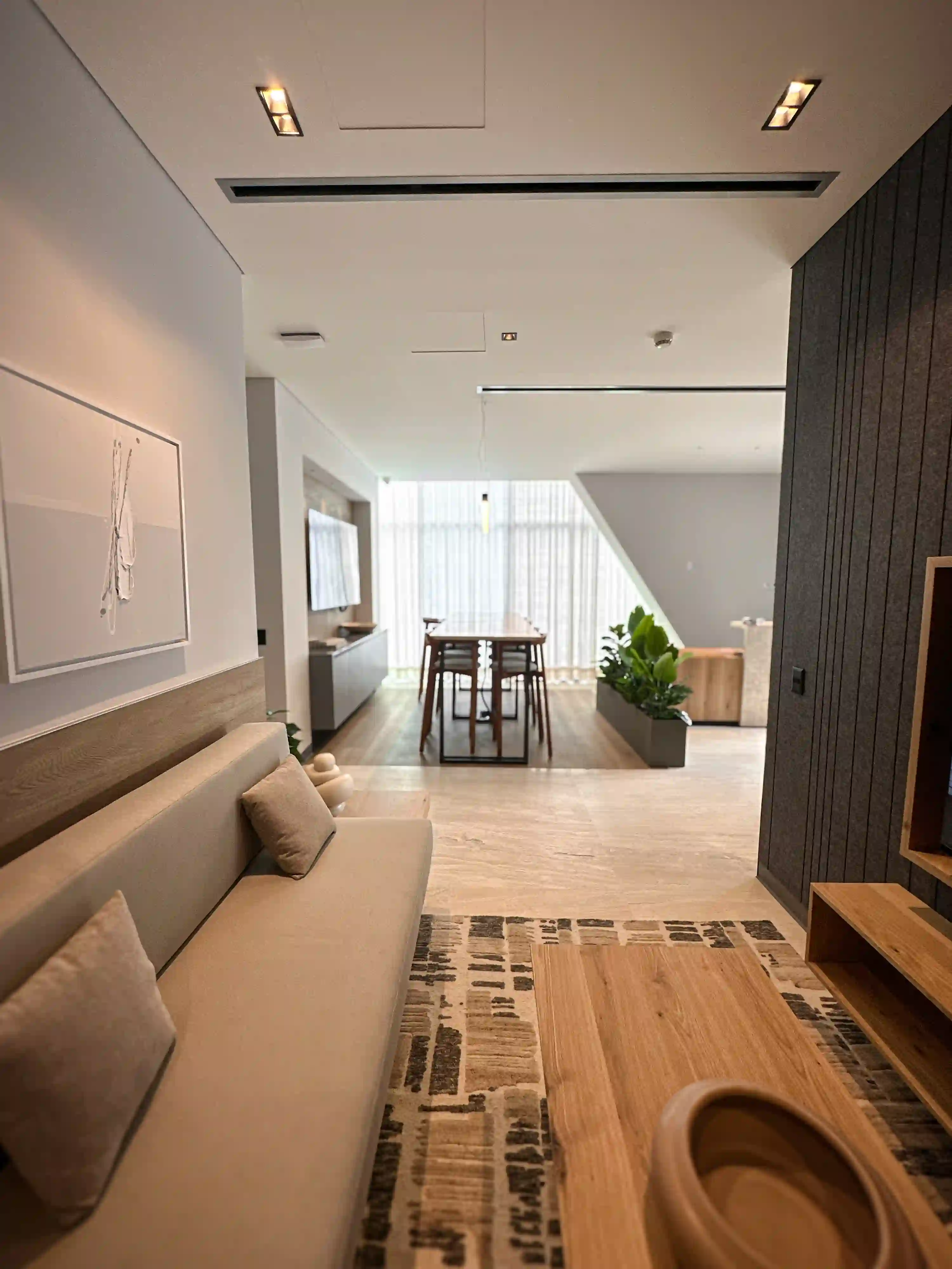 El uso de cortinas de lino traslúcido permite regular la entrada de luz solar, generando una iluminación difusa y etérea que suaviza las líneas rectas de la arquitectura. Las salas de negocios acristaladas ofrecen el aislamiento acústico necesario para la privacidad técnica sin sacrificar la sensación de amplitud del showroom. Al elegir estos acabados y disposiciones, Vitant Polanco no solo presenta un departamento muestra, sino que entrega una promesa de bienestar profundo y diseño de vanguardia, consolidando el espacio como un referente de interiorismo comercial y residencial en la Ciudad de México.