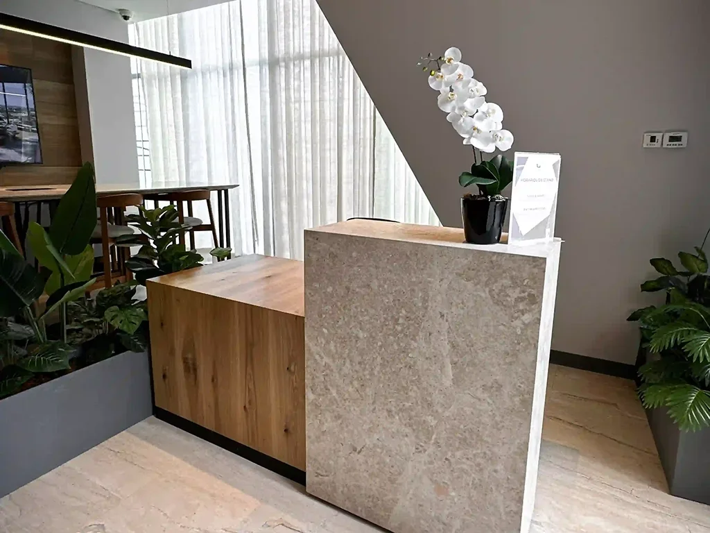 Los muros de acento en texturas pétreas oscuras y tonos grafito añaden una profundidad visual necesaria, otorgando un carácter sobrio y sofisticado que responde a las exigencias estéticas de la zona. Este primer contacto con el espacio establece un estándar de calidad superior, donde la integración de bloques monolíticos de piedra natural y estructuras de madera define una bienvenida que es, al mismo tiempo, profesional y profundamente acogedora para el futuro residente.