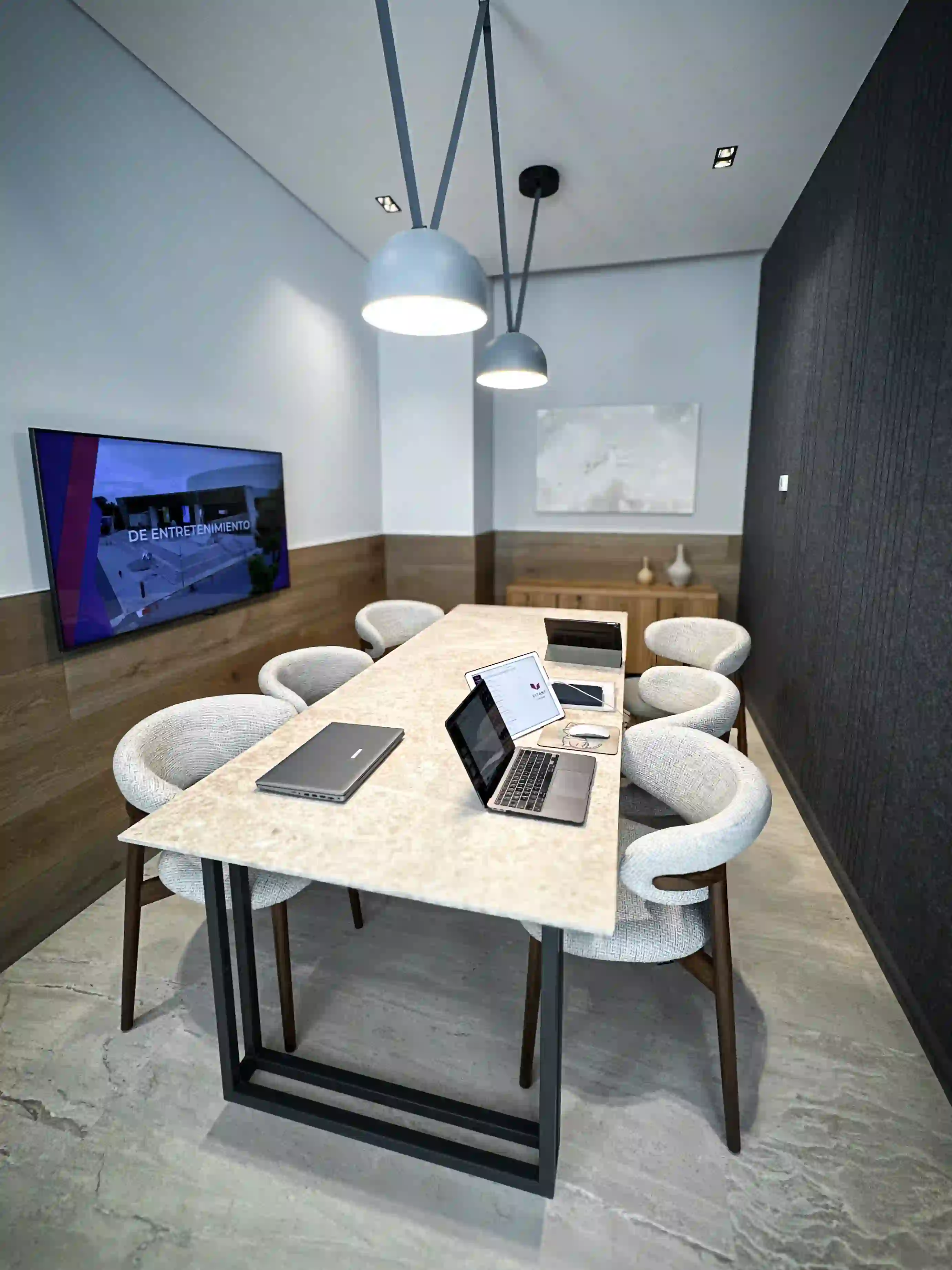 ESPACIOS DE CONVIVENCIA E INTERACCIÓNLa zonificación del showroom se ha planificado meticulosamente para ofrecer un recorrido fluido que alterna entre la exposición de marca y áreas de consulta privada de alto nivel. El área de lounge se presenta como un refugio de sofisticación relajada, equipada con mobiliario de diseño ergonómico en una paleta cromática de tonos tierra y ocres que invitan a la permanencia. Alfombras con patrones geométricos sutiles delimitan visualmente las zonas de estancia, creando islas de privacidad que permiten conversaciones pausadas y cierres de negocios en una atmósfera de total tranquilidad.