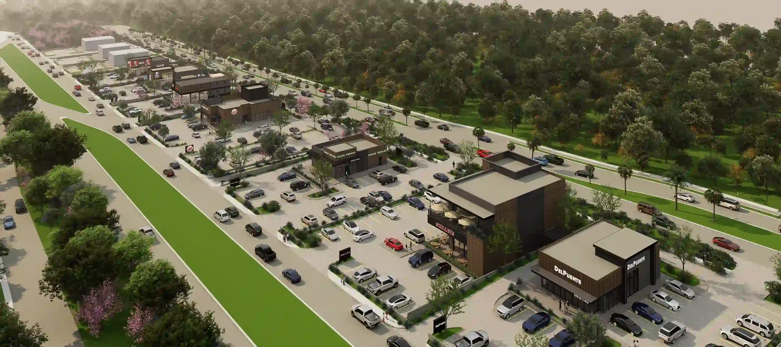 MASTERPLAN E INTEGRACIÓN URBANAPads Guatemala se posiciona como un referente en el desarrollo comercial de la región al proponer un esquema de "Power Center" que rompe con los paradigmas del retail tradicional. Estratégicamente ubicado en un entorno de alto flujo vehicular y rodeado de un cinturón boscoso privilegiado, el proyecto se despliega como un corredor lineal compuesto por edificaciones independientes o "pads". Este diseño maestro prioriza la eficiencia en los flujos operativos, integrando de manera fluida la cultura del Drive-Thru con carriles de desaceleración y espera que garantizan una experiencia ágil y segura para el usuario.
